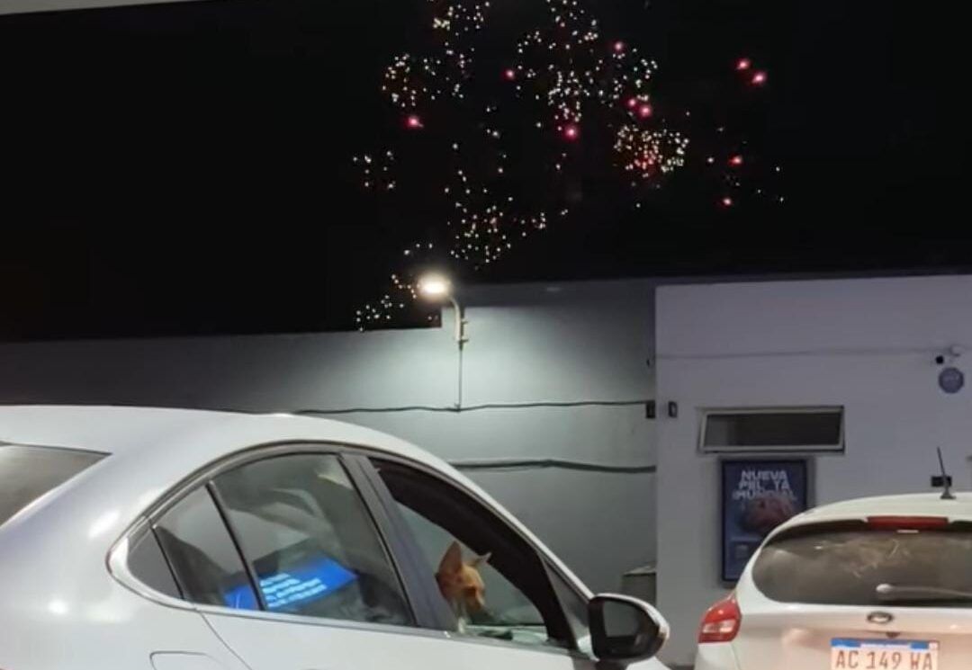 En el video se puede observar con claridad la reacción de las mascotas al escuchar el ruido de las detonaciones que le hacen muy mal a sus oídos. Un perro, que se encontraba arriba del auto de sus dueños, miraba hacia todos lados, como desorientado y sin saber de dónde provenían esos ruidos.