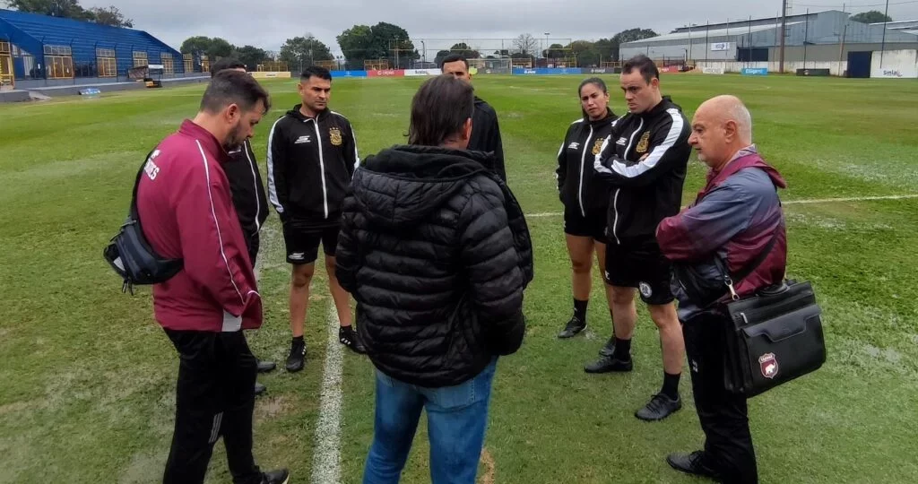 El encuentro debía jugarse este domingo en el estadio “” Tito” Cucchiaroni”, pero tras una recorrida por el campo de juego, el árbitro Mauricio Martin determinó que la pelota no rodaba con normalidad a causa del exceso de agua acumulada y luego de charlar con los integrantes de ambas delegaciones decidió suspender el match para el lunes a las 15:30 horas.