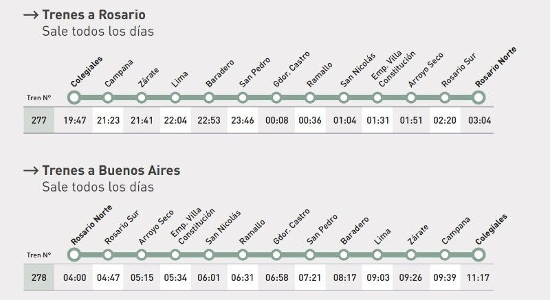 El nuevo diagrama convive con el cronograma inverso (Rosario–Buenos Aires), que también circula todos los días con salida desde Rosario Norte y llegada a Colegiales, respetando paradas intermedias.